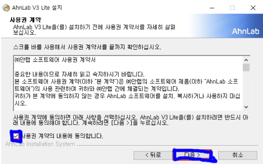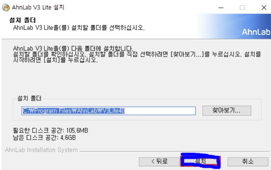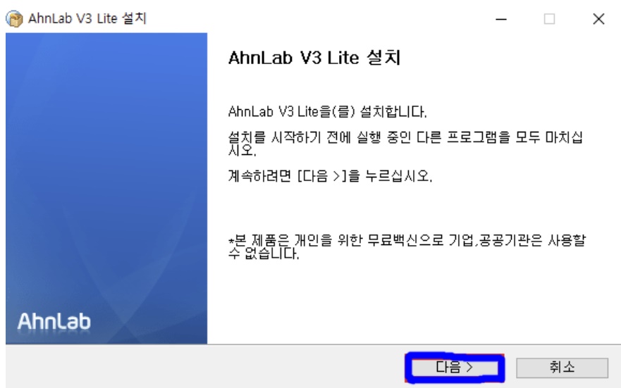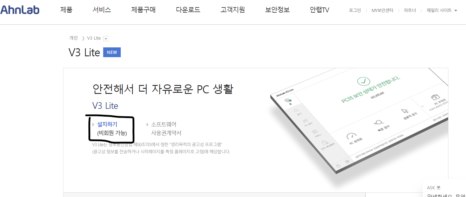 1. 아래의 링크에서 설치하기 버튼을 클릭하여 V3 Lite 공식버전을 다운로드 받으시길 바랍니다.