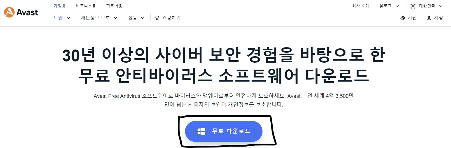 1. 아래 링크에서 다운로드를 클릭하여 AVAST 프로그램을 다운로드 받습니다.