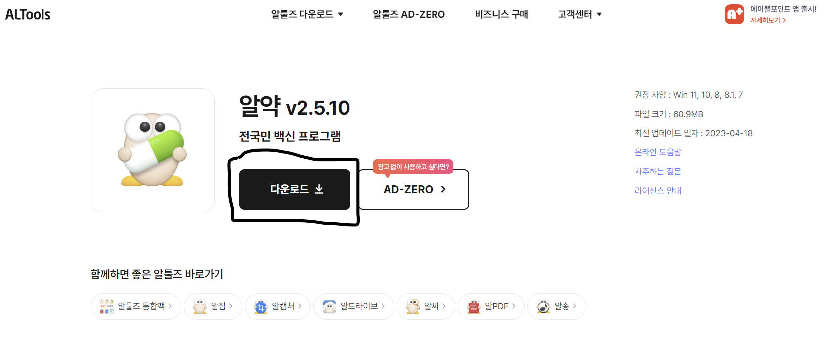 1. 아래 링크에서 다운로드를 클릭하여 알약 프로그램을 다운로드 받습니다.