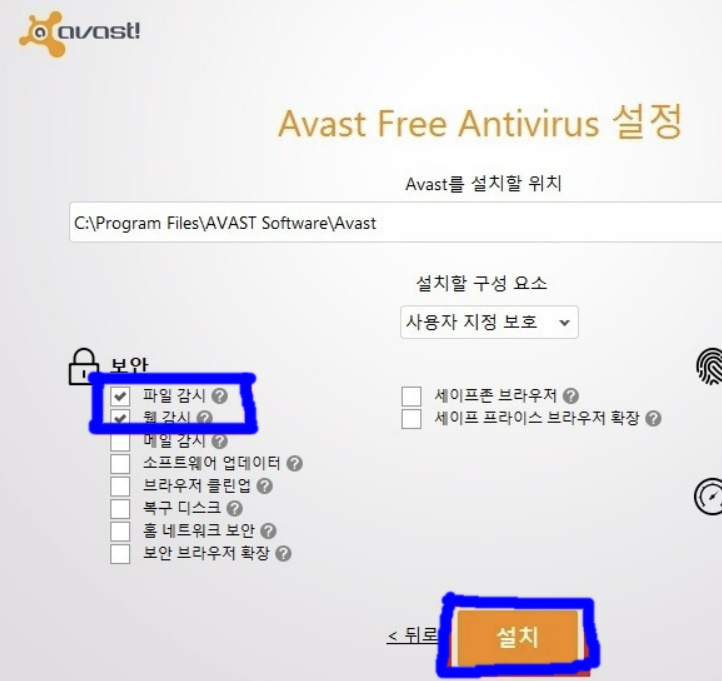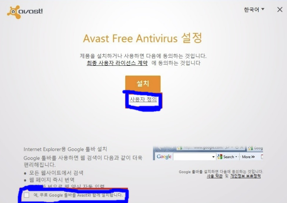 2. 다운로드 한 파일을 클릭하여 설치를 진행합니다. 설치 버튼으로 빠른 설치를 하여도 무방하지만 사용자 정의를 클릭하여 주로 사용하는 기능만 설치하여 불필요한 리소스를 줄여줍니다. 첫번째에서 무료 구글 툴바 설치를 해제 한후 사용자 정의에서는 파일 감시와 웹 감사 기능만 활성화 한 후 설치를 클릭합니다.