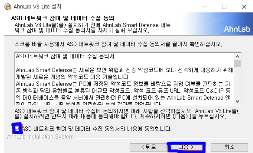 3. 사용권 계약 내용 확인 후 동의란에 체크 한 후 다음을 클릭합니다. 이후 ASD 네트워크 참여에도 동일하게 진행 후 다음을 클릭합니다.