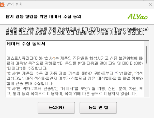 2. 다운로드받은 파일을 클릭하여 설치진행을 합니다. 최초로 라이센스 계약 동의에 동의와 데이터 수집에 동의를 클릭합니다.